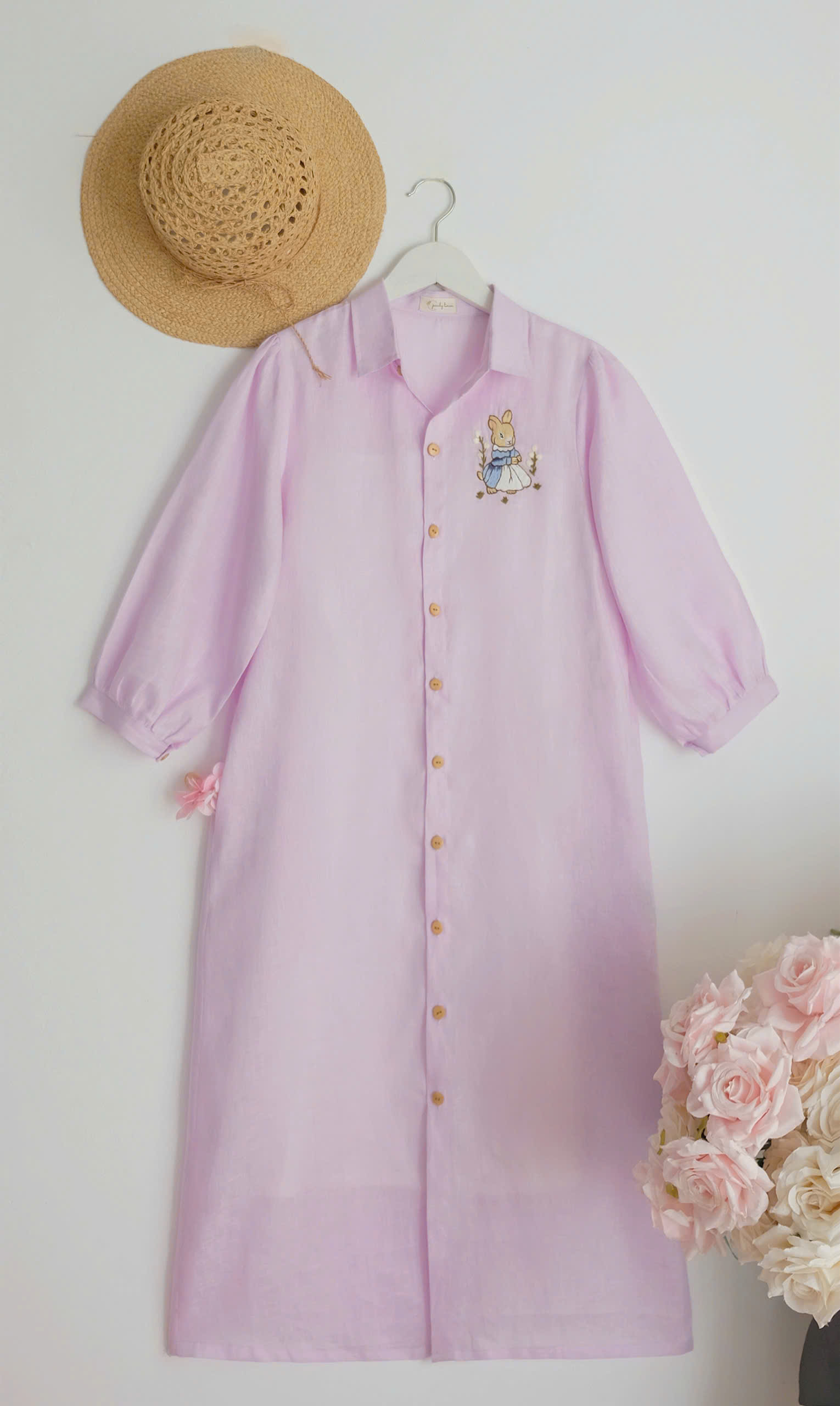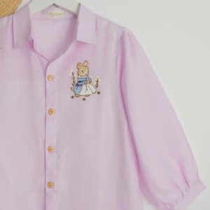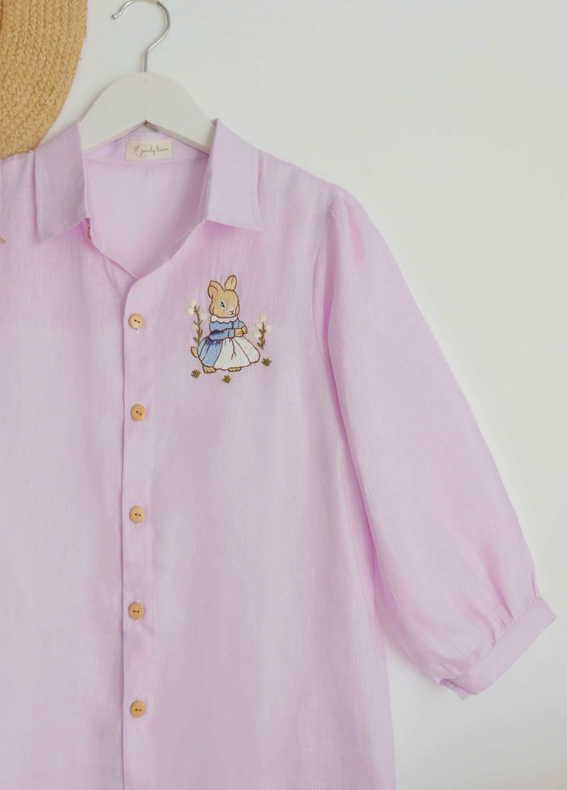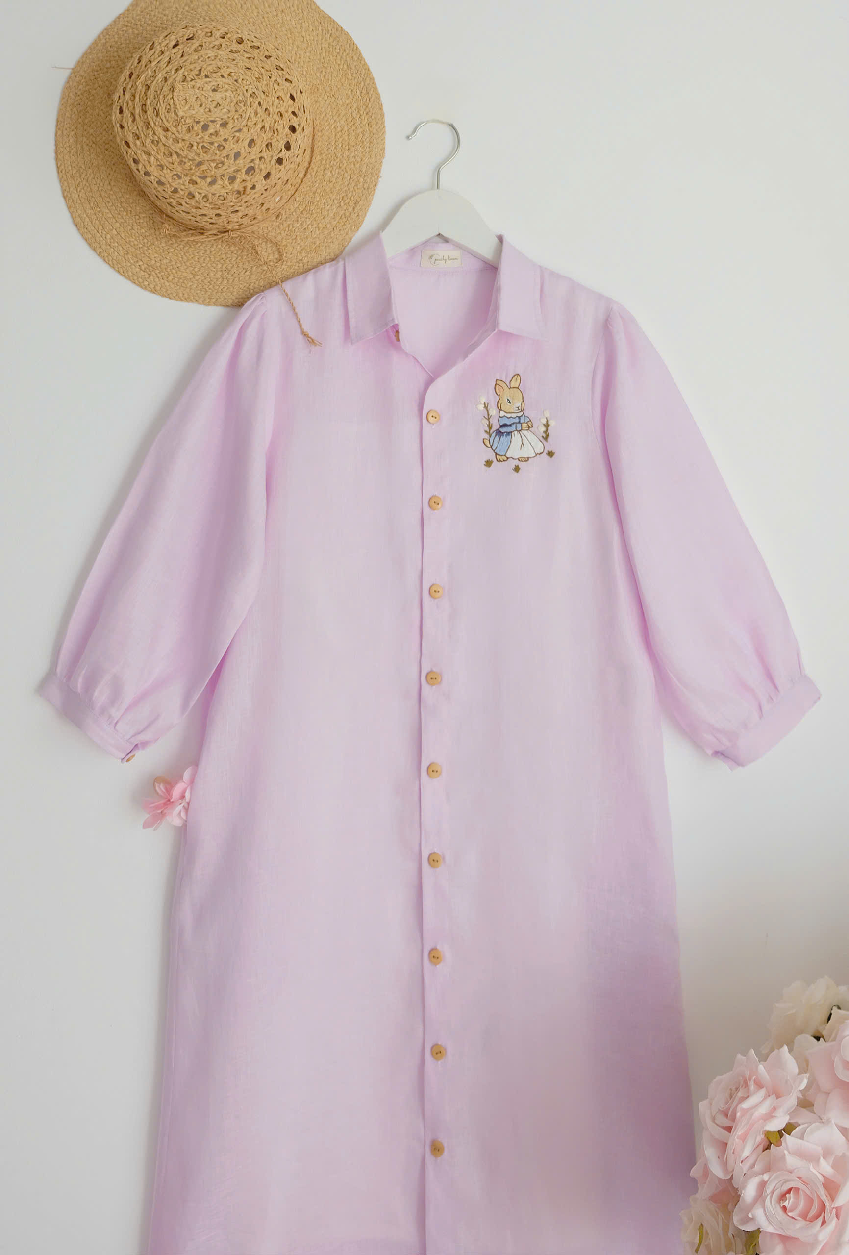 A delicate embroidered bunny detail on the chest adds a whimsical, storybook charm, while the wooden buttons bring warmth and a natural touch. The loose fit and breathable linen fabric make it perfect for everyday wear, from morning strolls to cozy afternoons.