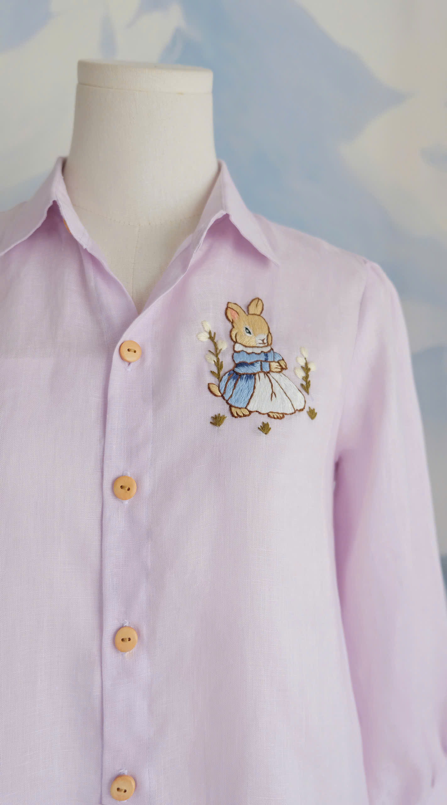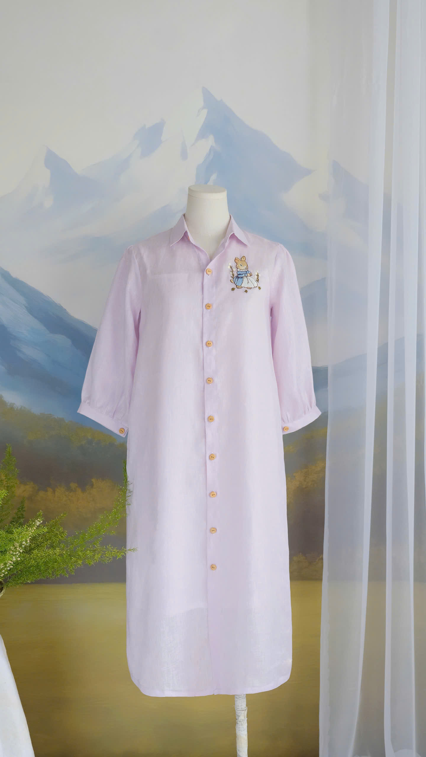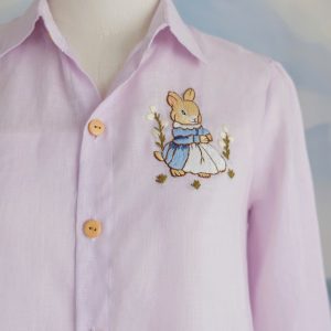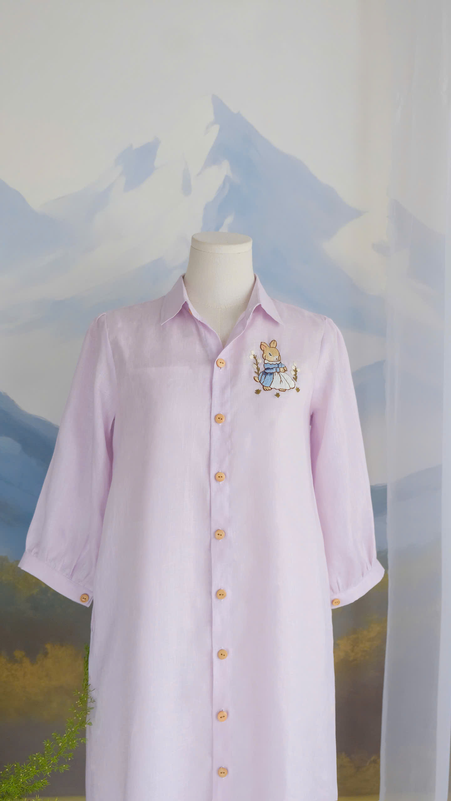 A delicate embroidered bunny detail on the chest adds a whimsical, storybook charm, while the wooden buttons bring warmth and a natural touch. The loose fit and breathable linen fabric make it perfect for everyday wear, from morning strolls to cozy afternoons.