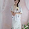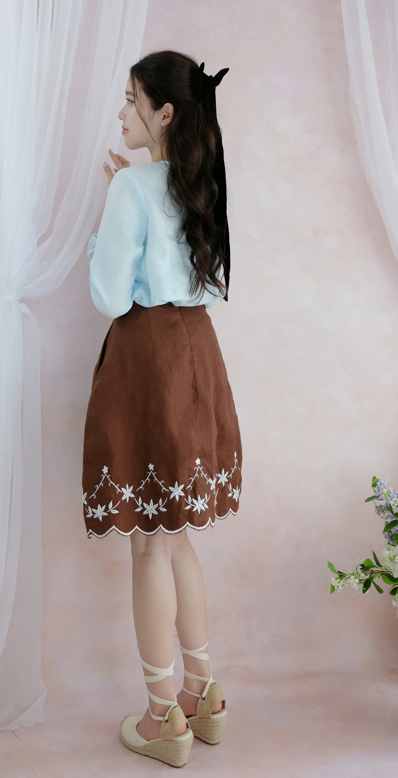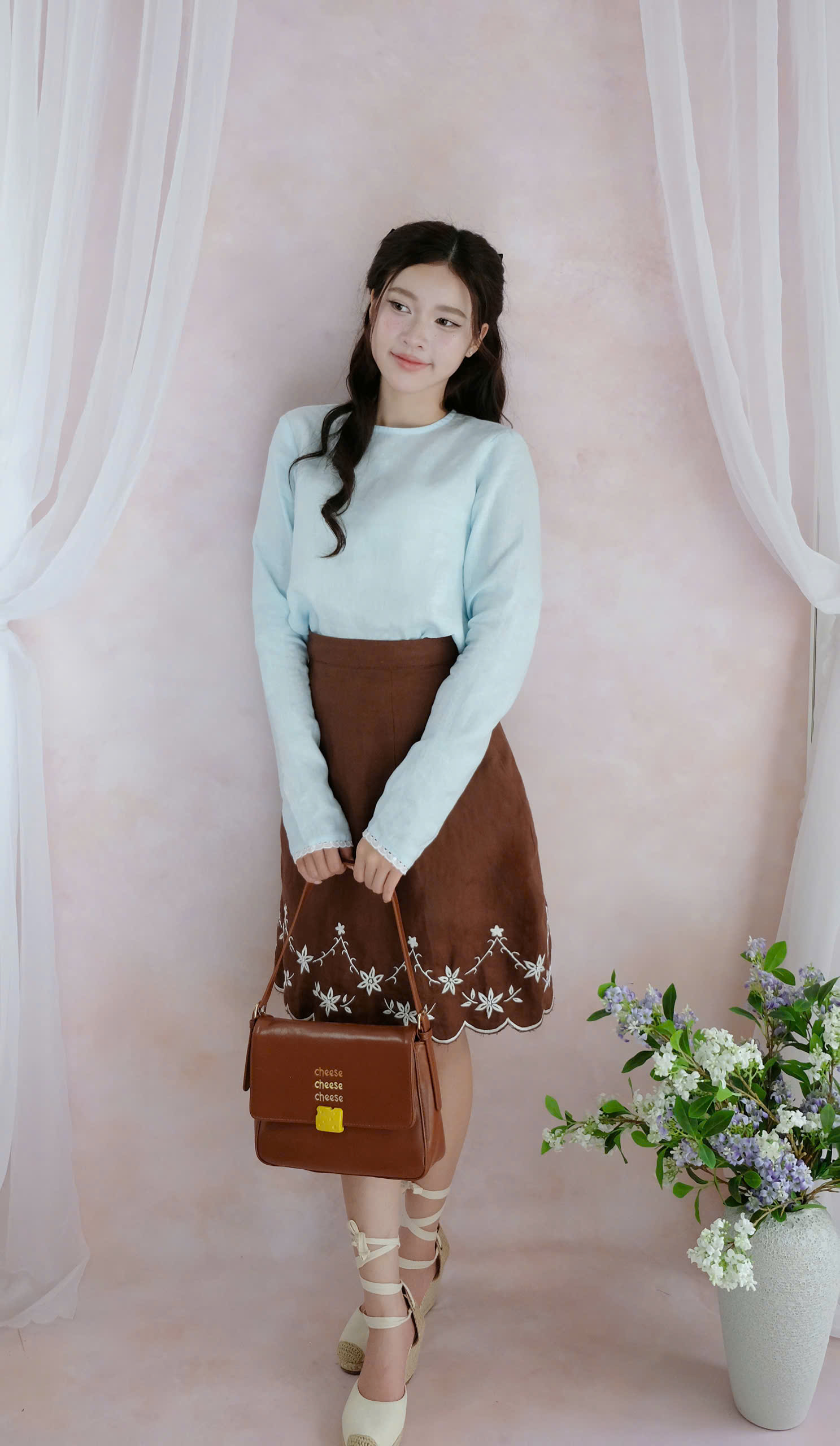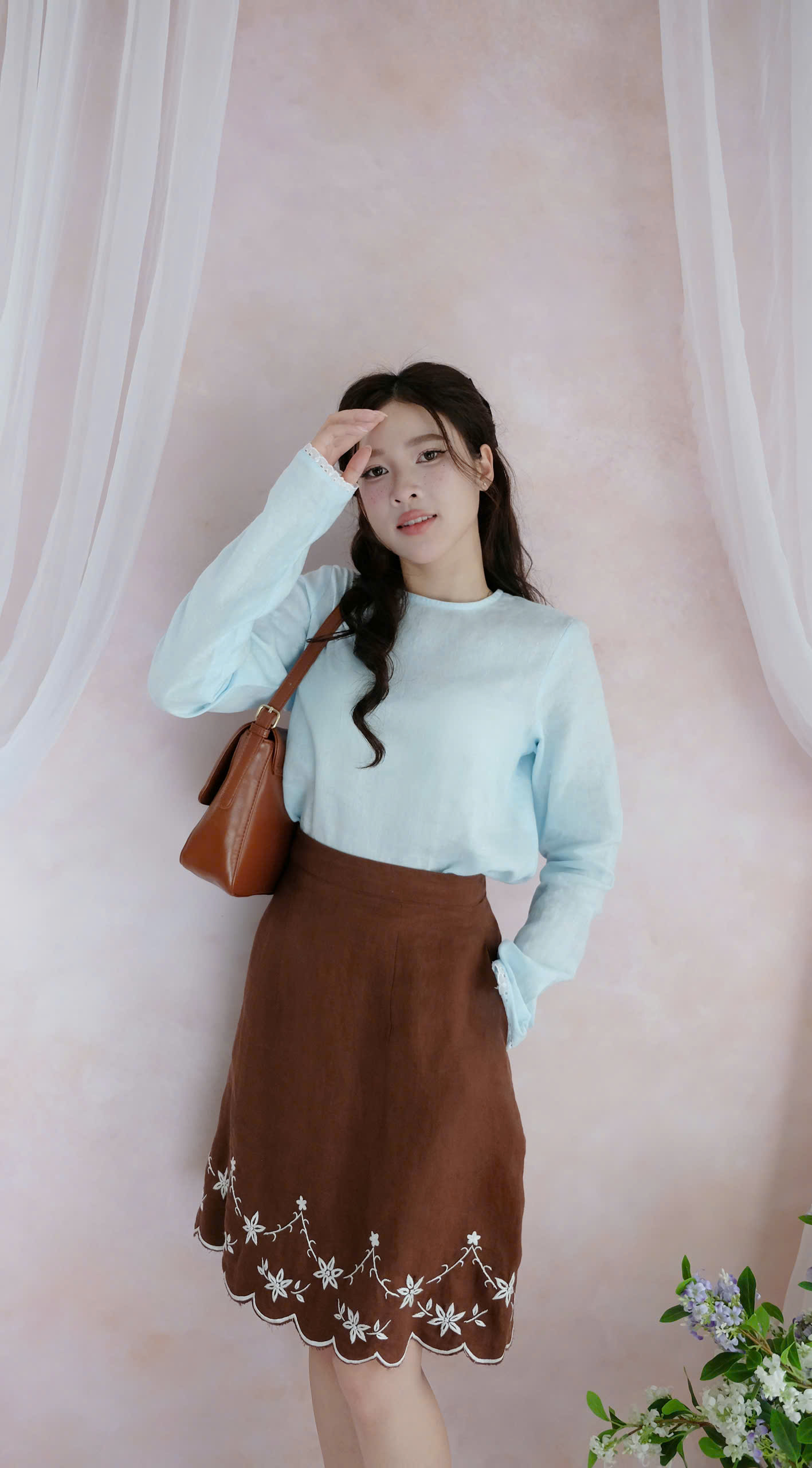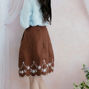 The skirt showcases intricate floral detailing along the hem, adding a graceful, handcrafted touch. Paired with a structured mini handbag and lace-up shoes, the ensemble creates a balanced blend of sweetness and sophistication.