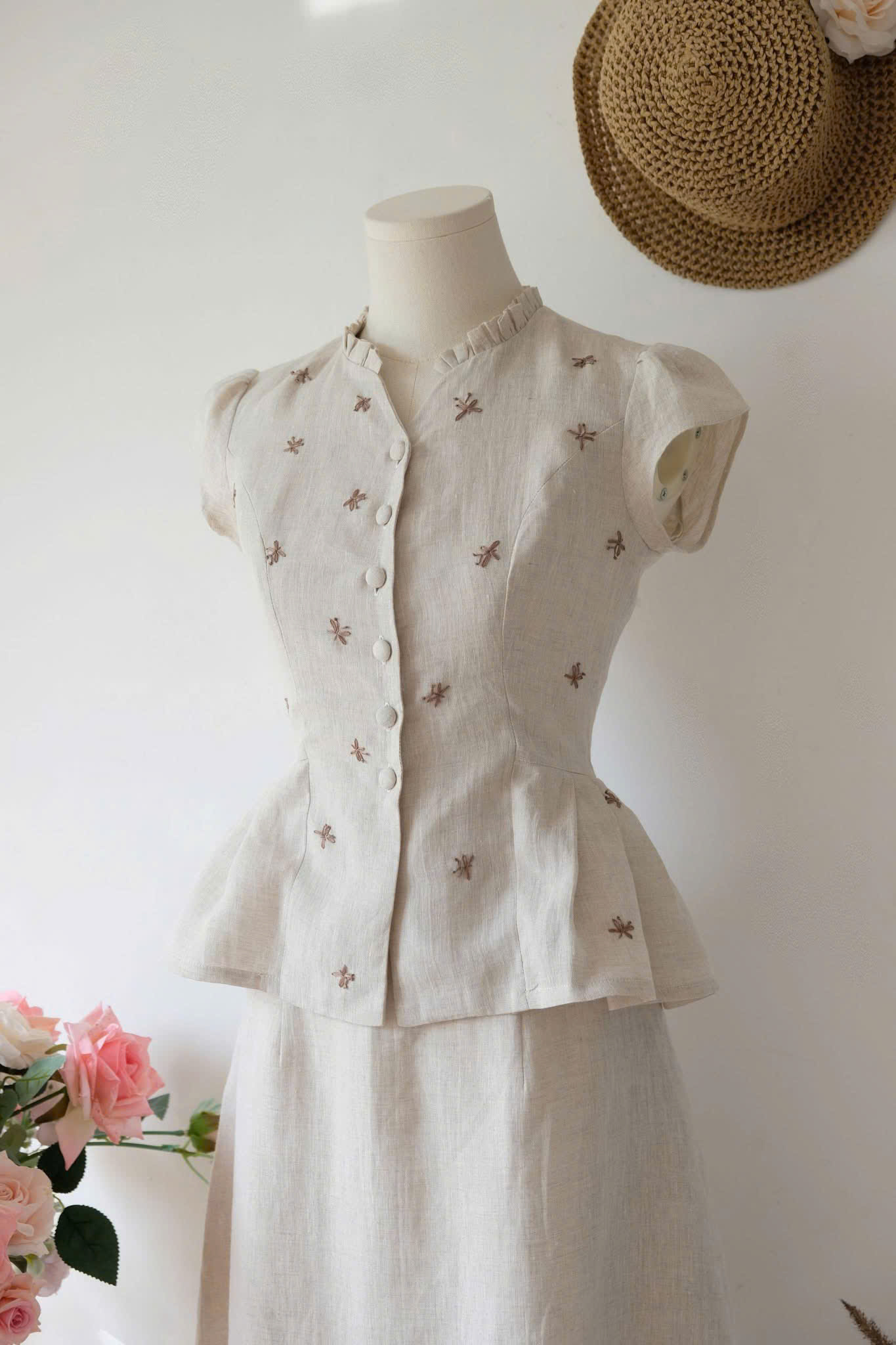 Step into a world of gentle elegance with the Daisy Whisper Linen Set. Handcrafted from 100% natural linen, this vintage-inspired ensemble features a delicate peplum blouse adorned with subtle embroidered florals and charming fabric buttons. The soft A-line skirt flows gracefully, offering both comfort and timeless femininity.
