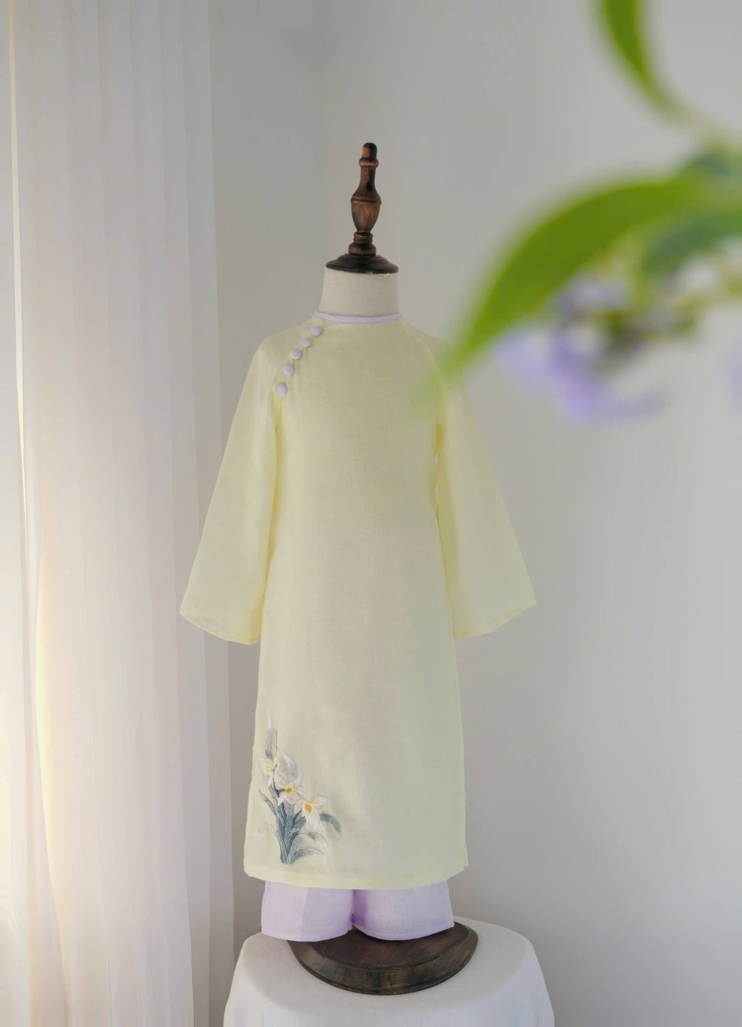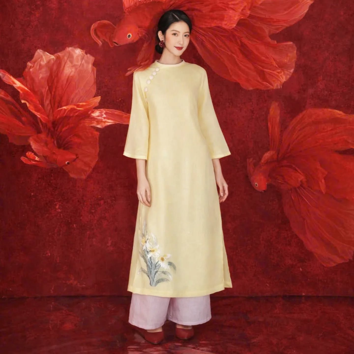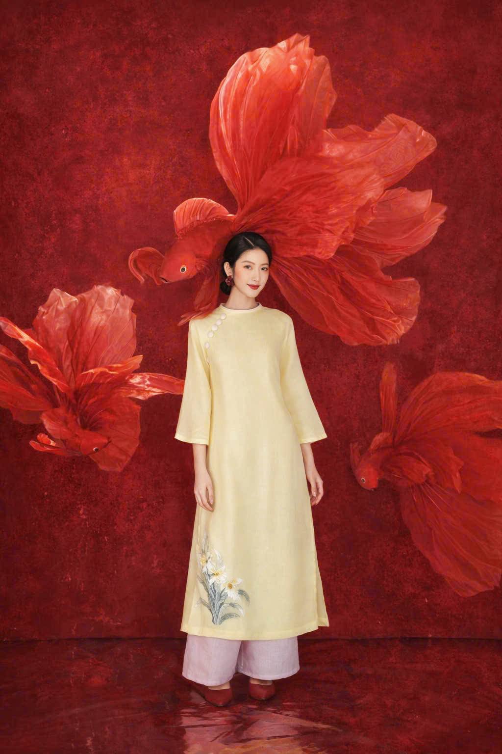 Elegant and timeless, the Golden Blossom Áo Dài Set captures the beauty of traditional Vietnamese design with a modern, graceful touch. Crafted in a soft pastel yellow tone, this áo dài features delicate floral embroidery along the hem, symbolizing femininity and gentle charm. The subtle button details on the shoulder add a refined accent, while the relaxed silhouette ensures comfort and ease of movement.